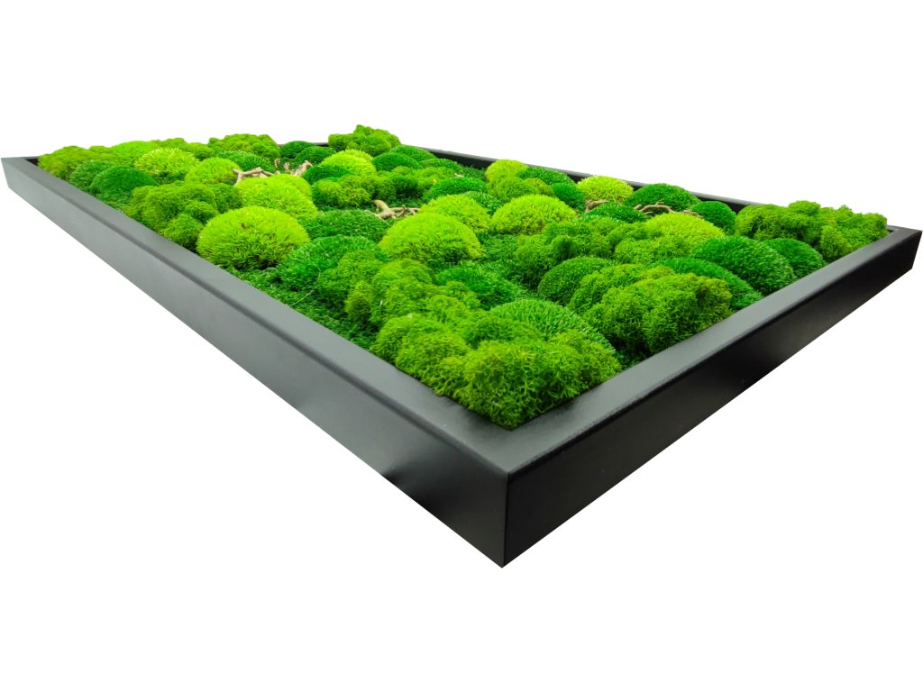 Krásný mechový obraz o rozměru 55 x 90 cm s kombinací mechů a větvičkami Bonsai. Kvalitní kovový rám černé barvy zaručí pevnost a velmi luxusní vzhled. Jeho podklad tvoří tmavě zelený plochý mech, který tvoří dokonalý kontrast s ostatními doplňky tohoto přírodního obrazu.