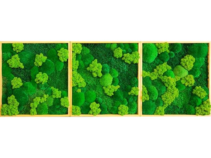 VÝHODNÁ SADA 3 obrazů o zorměru 56 x 56 cm! Obrazy lze zavěsit ve vodorovné i svislé linii. Výplň tvoří MIX mechů - kopečkový, plochý, sobí.
